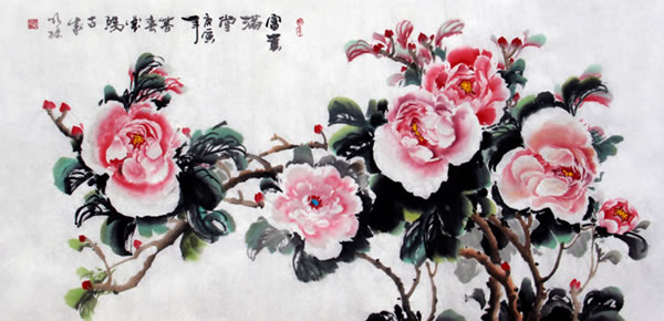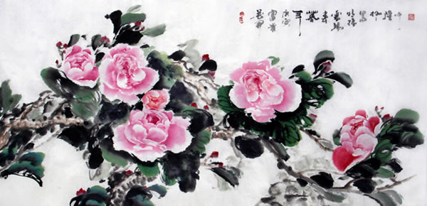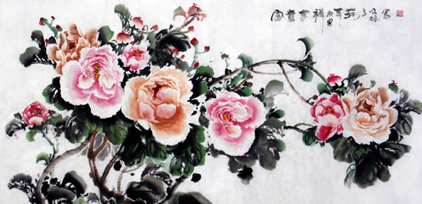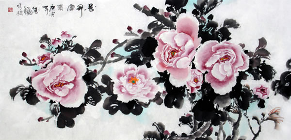 蔡明振为探寻独特的牡丹的表现语言,尝试了以运用色彩为主的表现手段,使作品平添了富丽的景象。色彩和其个性化的用笔,在画面意境营造中丰富了他作品的笔墨语言。此外,他把哲学理念淋漓酣畅地注入作品之中,展现出天人合一的辩证理念,真情地把对自然景观感悟后的心迹符号包容在他对人生透悟的哲学理念中,使画面形成一个由美感引起的思考深度。