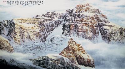 在中国山水画的艺术长廊中,赵幹的《江行初雪图》、赵佶的《雪江归棹图》、黄公望的《九峰雪霁图》等都是冰雪画中的极品。历代冰雪画家大多采用中锋勾勒和烘染留白的画法表现美丽的雪景。而当代冰雪画家、西部中国书画院院长李兵却用“块斧劈”(即多层次的笔触、多色彩的交融)表现西域雪山莹洁而丰富的景致。“块斧劈”是他通过对雪山光影变幻的仔细观察和精研小斧劈皴、大斧劈皴,并加以大量的实践探索出来的雪山画法。