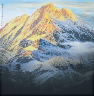 光感,极大地提高了西部雪山在造型、色彩和肌理上的表现力。其画法比传统山水画中其他的技法更能表现出西域雪山的特质,使画面的视觉冲击力更强。李兵笔下的雪山,随着太阳、云彩的变幻和从早到晚的时间推移而呈现出不同的景象———或灿烂夺目、或银光挥洒、或腾云拨雾、或身披红霞。李兵完全把自己融入雪山胜景之中,并把神奇的自然景致痛快淋漓地泼洒于宣纸之上。