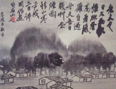 1922年的一天,齐白石一气儿画了四张条幅,稍事休息后,忽然发现画案上有块微微泛黄、一尺见方的皮纸。这块纸是买鞋时带的包装纸,上面还有厂家的印记。生性节俭的齐白石舍不得将它丢掉,用手摸了摸,觉得十分柔软,便准备在上面画一小幅山水。因是一张废纸,所以他画起来很是随意,横涂竖抹,无拘无束。他先用粗放的笔触写出几间房子,老笔纷披,不计工拙;接着用稍浓的墨画出一片密密的树林,与疏旷的房屋形成强烈的对比;最后用淡墨泼出远山,由于皮纸的渗化,产生了“溟蒙小雨来无际,云与青山淡不分”(金代诗人周昂诗句)的效果。此作画小而境大,笔简而意繁,给人以水气扑面、烟雾氤氲的感觉,真似鬼斧神工。画成后,他仔细品咂,感到妙趣无穷,更为佳作之出现欣喜异常,随即诗兴大发,提笔在画上写道: